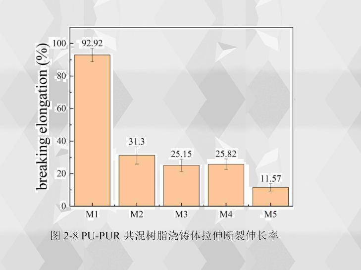 2-8可以看出樹脂澆鑄體的斷裂伸長率隨著聚脲成分的增加而呈現不斷下降的趨勢 M1聚氨酯具有最高的斷裂伸長率,達到了92.92%。添加了不同程度的聚脲成分導致混合樹脂的硬段含量增加,交聯密度增大,分子鏈運動更加困難,導致澆鑄體強度增加,呈現出斷裂伸長率顯著下降的趨勢。M2M3M4樹脂澆鑄體的斷裂伸長率比較接近,分別為31.30%25.15%25.82%,而M5聚脲的斷裂伸長率為11.57%,說明在拉伸載荷下,這三種樹脂澆鑄體相比聚脲可以承受更高的拉伸變形。