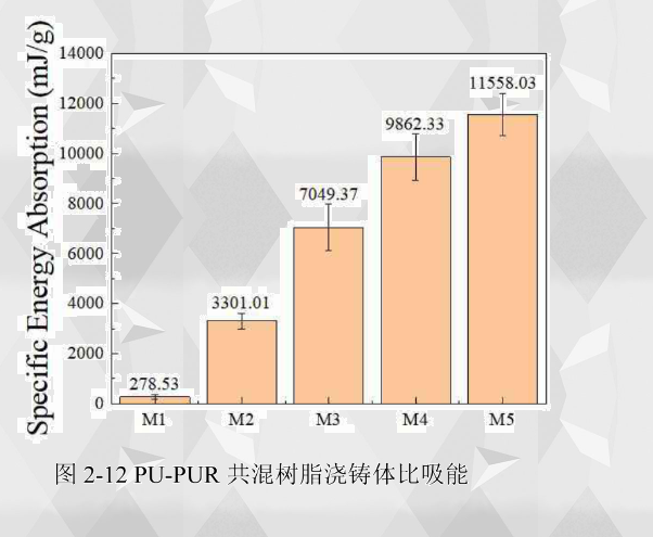 壓縮彈性模量表現(xiàn)材料在壓縮荷載作用下彈性變形的能力大小,反應(yīng)出材料發(fā)生彈性變形的難易程度。從圖2-11(a)中得到,樹脂澆鑄體的壓縮彈性模量隨著聚脲組分的增 加而不斷增加,這和拉伸彈性模量的增加趨勢(shì)一致。M1聚氨酯的壓縮彈性模量數(shù)值較低,為4.83MPa。M2樹脂澆鑄體的壓縮彈性模量為14.70MPa,相比聚氨酯增加了204.35%。M3樹脂澆鑄體的壓縮彈性模量為34.03MPa,相比M2增加了131.50%。M4樹脂澆鑄體的壓縮彈性模量為248.43MPa,相比M3增加了630.03%。可以看出,M3的壓縮彈性模量增幅很大,在聚脲所占比例達(dá)到50%后,彈性模量的提升更加明顯,說明此時(shí)聚脲成分在樹脂澆鑄體中占據(jù)主要作用,支撐起了材料的結(jié)構(gòu),使得樹脂澆鑄體抵抗彈性變形的能力得到極大增強(qiáng)。M5聚脲的壓縮彈性模量最高,為832.54MPa。壓縮強(qiáng)度表示材料抵抗壓縮載荷而不失效的能力,在聚脲組分占混合樹脂的比例不斷增加的過程中,材料的塑性特征越來越明顯,其壓縮強(qiáng)度也不斷增強(qiáng)。從圖2-11(b)中得到M1聚氨酯的壓縮強(qiáng)度較低,為1.71MPa。M2樹脂澆鑄體的壓縮強(qiáng)度為13.31MPa,相比比聚氨酯增加了678.36%。M3樹脂澆鑄體的壓縮強(qiáng)度為34.88MPa,相比M2增加了162.06%。M4的壓縮強(qiáng)度為42.65MPa,相比M3增加了22.28%。M5聚脲的壓縮強(qiáng)度為42.09MPa。可以看出,在聚脲所占比例在50%以下的時(shí)候,樹脂澆鑄體壓縮強(qiáng)度增加非常明顯,而聚脲所占比例在50%以上的時(shí)候,其壓縮強(qiáng)度增加有限,M3、M4和M5的壓縮強(qiáng)度較為接近且大于M1和M2樹脂澆鑄體,M4和M5壓縮強(qiáng)度最高且相差很小。