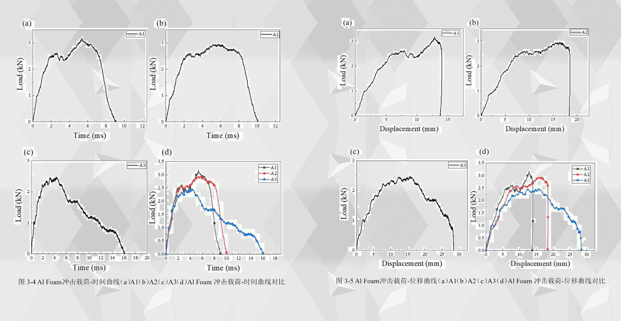 如圖3-4所示為Al Foam板在30J、40J和50J落錘沖擊能量下的載荷-時間曲線圖。 從圖中可以看出,Al Foam板在落錘沖擊荷載下的載荷-時間曲線分為三個階段。在第一個階段,在沖擊作用下,荷載隨著時間而呈現直線上升趨勢,三種沖擊能量下的載荷-位移曲線圖的第一階段斜率都很接近。在第二個階段,曲線開始波動上升,直到上升到載荷的最大值。A1的沖擊峰值載荷為3170N,A2的沖擊峰值載荷為2957N,A3的沖擊峰值載荷為2475N,從沖擊峰值載荷可以看出,沖擊能量為30J和40J時,其沖擊峰值能量相近,這是由于沖頭未能穿透Al Foam板 ,Al Foam板的自身強度使得沖擊載荷維持在較高水平,而在沖擊能量為50J時,高沖擊能量下沖頭已經穿透了Al Foam板,Al Foam板的沖擊中心區域已經破壞,所以其沖擊峰值能量較低。在第三個階段,沖擊荷載開始隨著時間下降,A1和A2的載荷下降速度快于A3,這是由于A1和A2未能擊穿Al Foam板,沖頭在沖擊過程中停止較快,而A3由于沖頭在沖擊過程中穿透了Al Foam板,所以其載荷下降速度較慢。