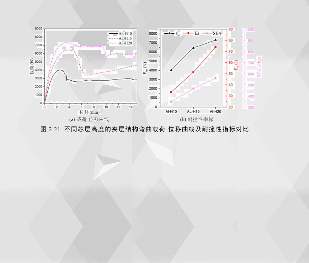 為了研究芯層對夾層結(jié)構(gòu)力學(xué)性能的影響,分別比較了不同芯層高度和不同芯層密度的鋁合金夾層結(jié)構(gòu)的載荷-位移曲線及耐撞性指標(biāo),如圖2.21和圖2.22所示。芯層高度為10mm的AL-H10和芯層高度為15mm的AL-H15的載荷位移曲線屬于類型I,芯層高度為20mm的AL-H20的屬于類型Ⅱ;AL-H10的臨界失效模式為下界面分離(DB),AL-H15的臨界失效模式為芯層剪切(CS),AL-H20臨界失效模式為壓痕壓入(IN)。從耐撞性指標(biāo)圖中可以看出,試件的芯層高度從10mm到20mm,其臨界失效載荷、總吸能和比吸能分別提高了81.27%、120.97%和60.68%,因此,鋁合金夾層結(jié)構(gòu)的臨界載荷、總吸能和比吸隨芯層厚度而增加,其臨界失效模式從界面分離(DB)轉(zhuǎn)為芯層剪切(CS)再到壓痕壓入(IN)。表2.7總結(jié)了三種芯層高度的鋁合金夾層結(jié)構(gòu)具體的臨界載荷、總吸能、比吸能和平均載荷值。