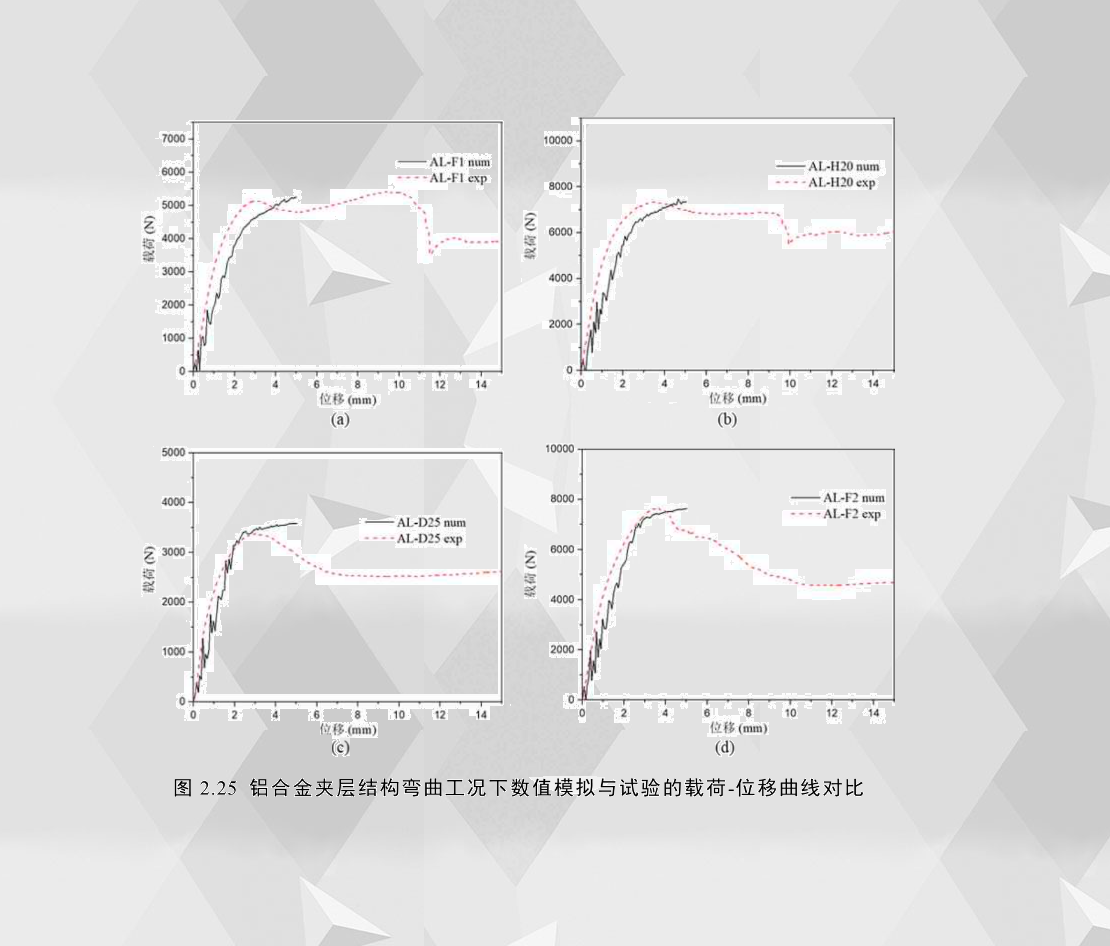 圖2.25展示了四種試件在彎曲位移0至5mm的數(shù)值模擬載荷-位移曲線(xiàn)及其相應(yīng)的實(shí)驗(yàn)曲線(xiàn),其中(a)和(b)的臨界失效模式為壓痕壓入(IN),(c)和(d)為芯層剪切(CS),圖中曲線(xiàn)均為原始數(shù)據(jù),未作濾波處理。