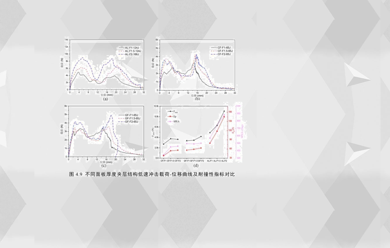 為了研究夾層結(jié)構(gòu)的面板厚度對沖擊性能的影響,圖4.9(a)-(c)比較了三種不同面板厚度的夾層結(jié)構(gòu)的載荷-位移曲線。無論是彈塑性面板還是脆性面板,夾層結(jié)構(gòu)的面板厚度對其低速?zèng)_擊響應(yīng)均有較大影響。為了更直觀地比較,圖4.9(d)對比了不同面板厚度夾層結(jié)構(gòu)的耐撞性指標(biāo),通過觀察,鋁合金夾層結(jié)構(gòu)的耐撞性能隨面板厚度增加而明顯增加,面板厚度從1mm增加到2mm,其初始峰值載荷、穿透吸能和比穿透吸能分別提高了84%、108%和54%;對玻璃纖維夾層結(jié)構(gòu)而言,當(dāng)面板厚度從1mm增加到2mm,其初始峰值載荷和穿透吸能分別只提高了24%和13%,而面板厚度的增加對比穿透吸能的影響效果差異不大;而對碳纖維夾層結(jié)構(gòu)而言,當(dāng)面板厚度從1mm增加到2mm,其穿透吸能和比穿透能分別提高了42%和33%,并且隨著層數(shù)的增加,耐撞性指標(biāo)增加的幅度大幅減小。