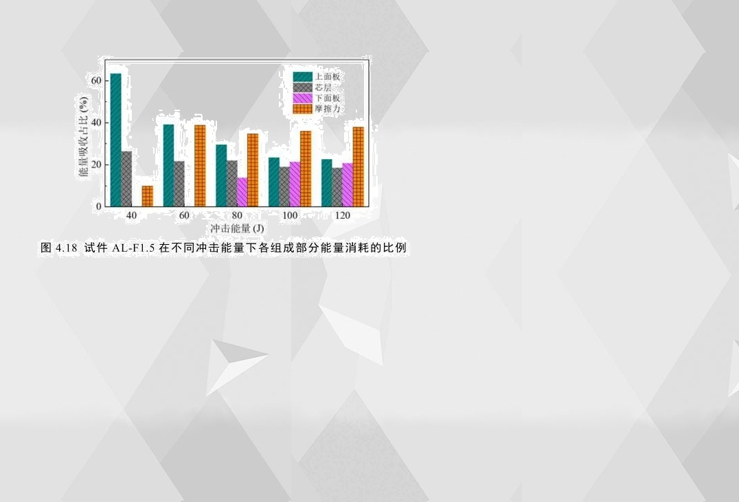4.18AL-F1.5在不同沖擊能量下各組成部分能量吸收的比例。上面板消耗的能量比例在小能量(40J)沖擊下最大(高達(dá)64%)芯層耗能占比為26.5%因此在小能量沖擊下,增強(qiáng)上面板和芯層的防護(hù)更能提高結(jié)構(gòu)的耐沖擊性能;當(dāng)下面板完全穿透時,摩擦力消耗的能量占比最高(約為38%);有趣的是,在各沖擊能量下,泡沫芯層吸能占比均在20%左右;此外還發(fā)現(xiàn),無論夾層結(jié)構(gòu)穿透與否,上面板的耗能占比均大于下面板,這說明增強(qiáng)上面板更能提高夾層結(jié)構(gòu)的耐沖擊性。